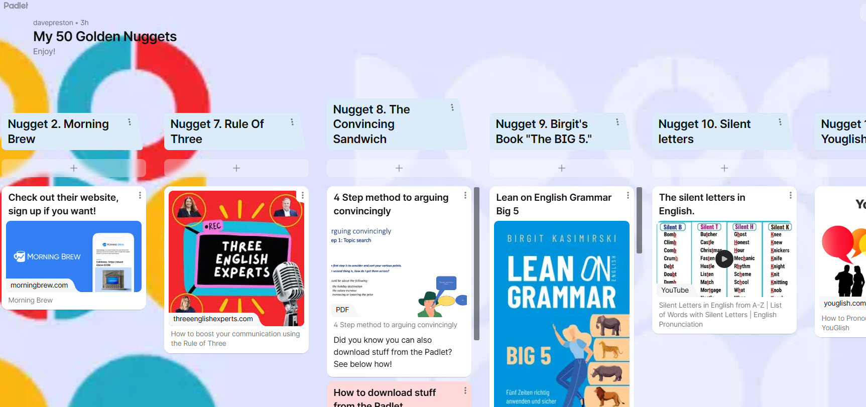 As a thank you, you’ll receive our 50 Golden Nuggets PDF Booklet and the accompanying interactive „Learning Board“ Padlet for FREE. (See below)